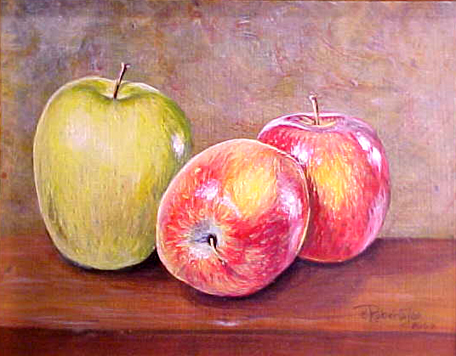 I love the way these crisp, succulent apples' shapes fit together in this little still life. As I always do with still life subjects, I set them up in natural light, and I think that's why the color is so rich and luscious. Nothing beats painting outdoors if you want to capture light and color.
