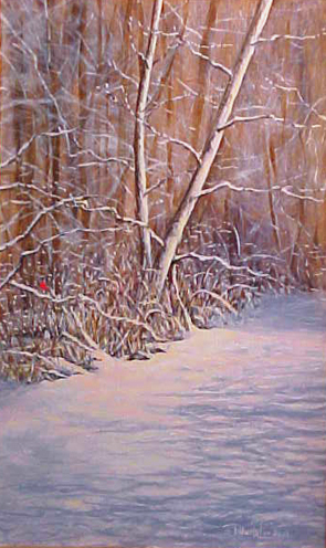 Bare Bones is a painting about the stripped-down, minimalist, monotone quality of winter. I enjoy winter because it's possible to see the architecture of nature: trees without leaves, a naked landscape that is utterly honest about structure. Even with the softening of a fresh layer of snow, this scene expresses the simplicity of winter. The male cardinal (that bright red dot to the left) is a reminder that life goes passionately on in spite of how bleak the landscape can appear, however. Not all species find winter as inhospitable place as humans do!