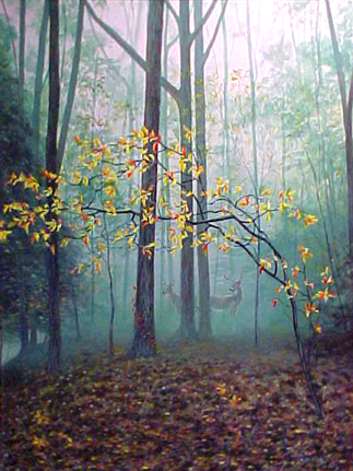 I painted it at the edge of a woods a few miles from my home during two very cool and misty days. Frankly, it was a physical challenge to finish it because the weather was not exactly conducive to sedentary work outdoors. Most of the time it was drizzling rain, which had the advantage of keeping my acrylic palette moist, but otherwise has little to recommend itself for painting on site. Nevertheless, I enjoy this piece a lot and seem to grow fonder of it as time goes by. I've been told it's a very romantic piece, that there is quality of softness and hopefulness to it that is difficult to put into words. I think that has something to do with the color range and the contrast between the soft gray/green of the mist and the crisp orange/yellows of the leaves still clinging to the little Witch Hazel tree in the foreground.