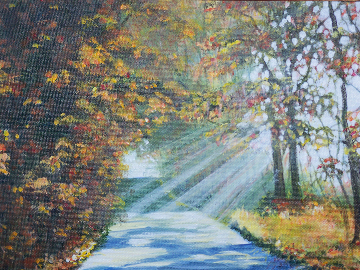 This was the view south on the backcountry road n rural Bucks County, PA, on which I lived for 30 years. I painted this little piece late in the afternoon in October, as the sun rode low across the sky, streaming through the leaves remaining on the trees in shallow-angled crepuscular rays. I walked my dogs on that section of road many hundreds of times but never tired of the myriad weather and lighting conditions I found.