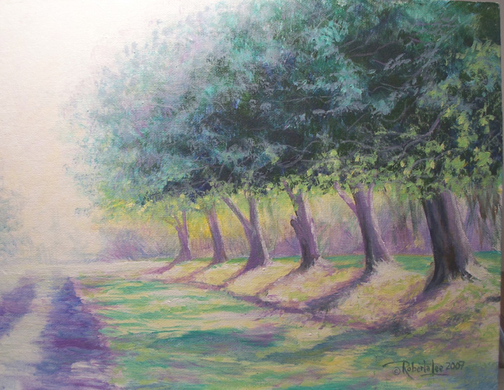 This stand of very old apple trees lines a backcountry road in a rural portion of Bucks County, PA. I painted them on a sunny spring afternoon, backlit as the sun rose in the sky.