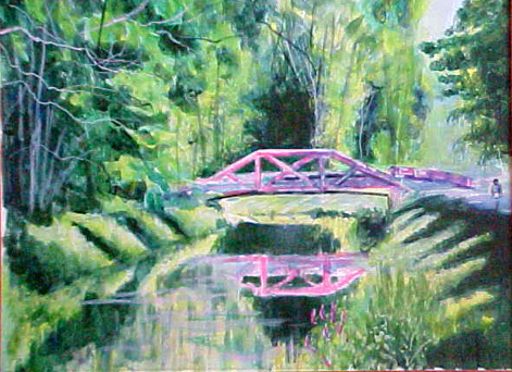 This is a painting that speaks to me very directly. I grew up in a house that abutted the towpath of the Delaware Canal in Washington Crossing, Bucks County, PA. As a child I found great delight in the still, reflective surface of the canal, the massed greenery alongside it and the elegantly curving delineation of the towpath-----which was bermed so that mules had a pathway from which to tow mule barges, but which in time became a perfect, wide hiking path.