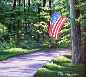Solebury Township, Bucks County, has kept the rural/pastoral quality most of Bucks had when I was growing up in the small town of Washington Crossing. This painting depicts a small corner of Solebury, along Cuttalosa Road, where someone had taken the trouble to hang a flag out in honor of the 4th of July. The road itself is narrow, barely qualifies as "paved" and encourages drivers to slow down and enjoy the peace and quiet that surrounds them.