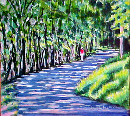 Fretz Mill Road, in Plumstead Township, Bucks County winds up a very steep grade, rising from Paunnacussing Creek to the plateau above at an angle that makes walking up it a real challenge. Which also makes it one of my favorite places to walk for exercise and relaxation. At the height of summer the sunlight filters through the trees and absolutely dazzles. The Red Teeshirt celebrates summer, light and heat.