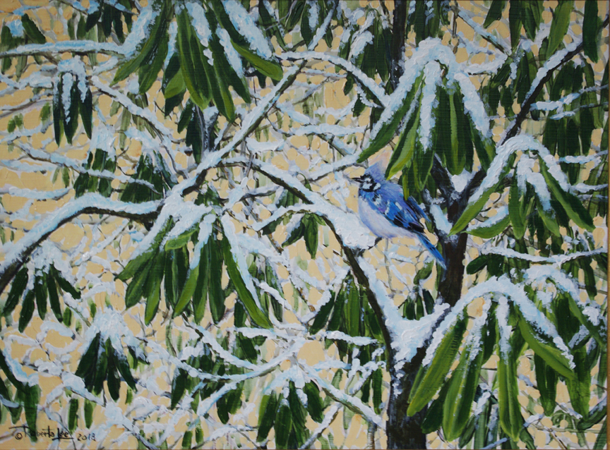 The large Rhododendrons that flank one side of my home have provided endless subject matter for paintings over the years, in all seasons. I painted this snowscene looking out a window into the interior of the Rhodo and I love the pale peach glow of the reflected light behind the plant material! A Blue Jay arrived during the painting process and hung out there for awhile, all puffed up as insulation against the cold. He brings life into the piece and turns what might otherwise be a very chilly scene into one much more interesting and somehow warmer by virtue of his presence.